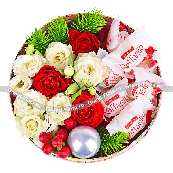 Люкс: роза красная - 5 шт., роза кустовая белая - 4 шт., гиперикум - 2 шт., ель, конфеты Raffaello, елочная игрушка – 2 шт., оазис, коробка.